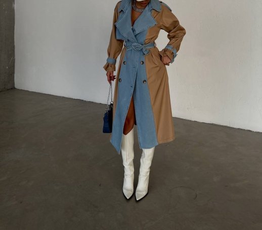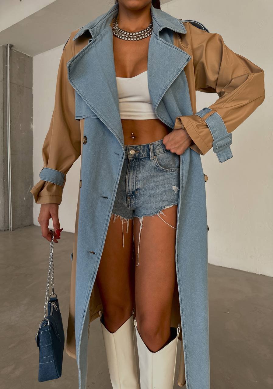 DENIM AND FAUX LEATHER TRENCHCOAT