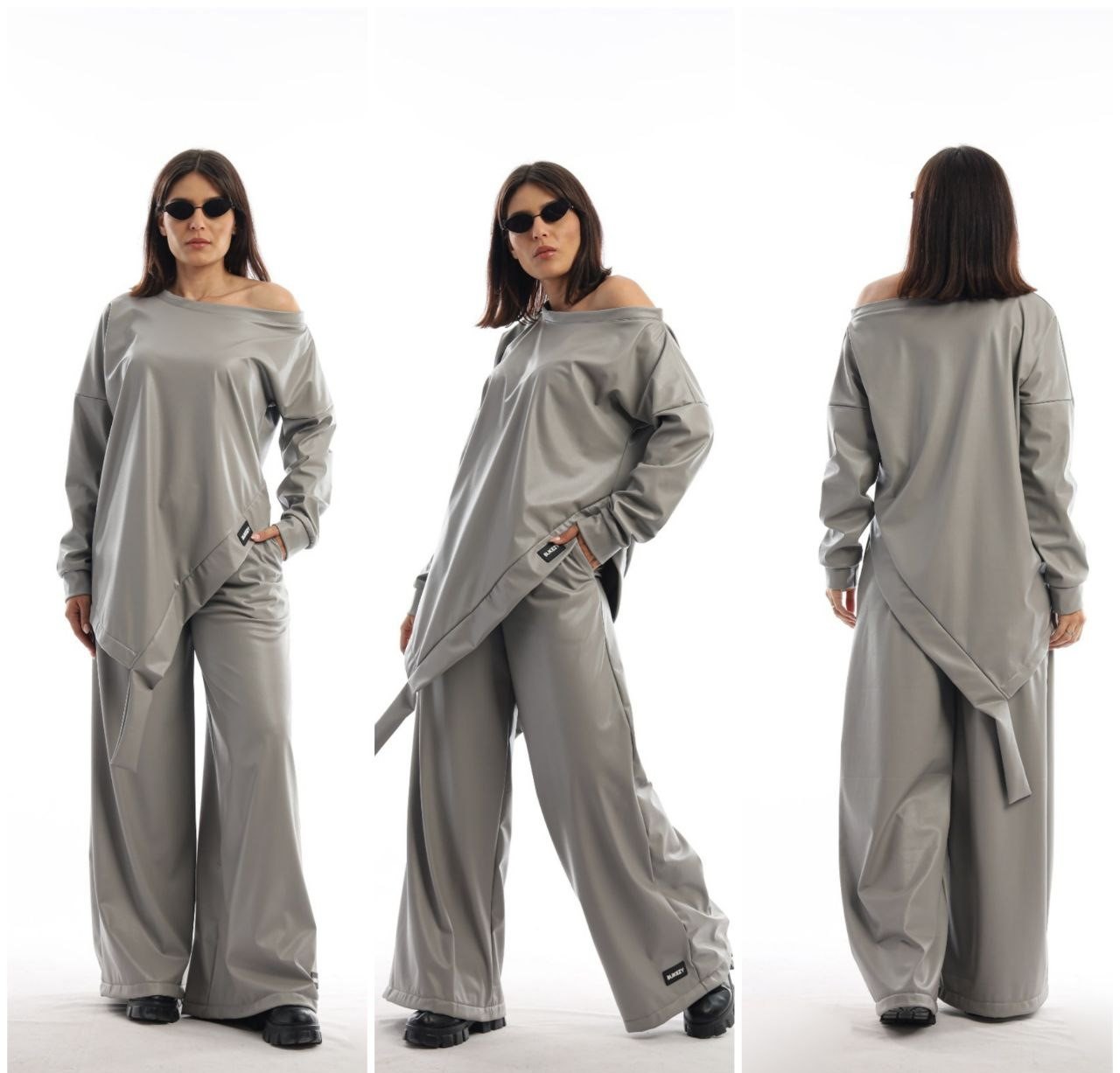 FAUX LEATHER ANGLED TOP AND FLARED PANT