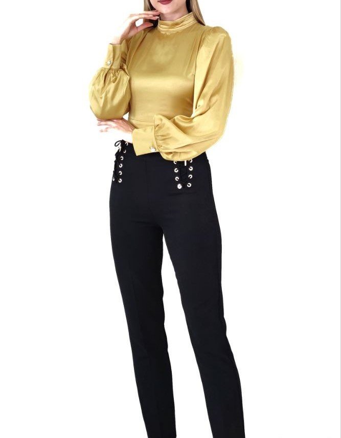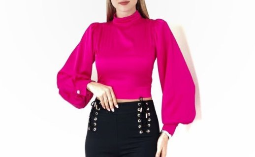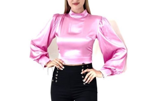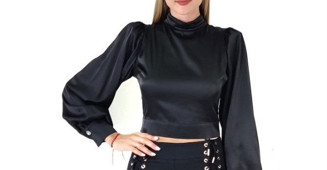 HIGH NECK LONG SLEEVE BLOUSON SATIN BLOUSE