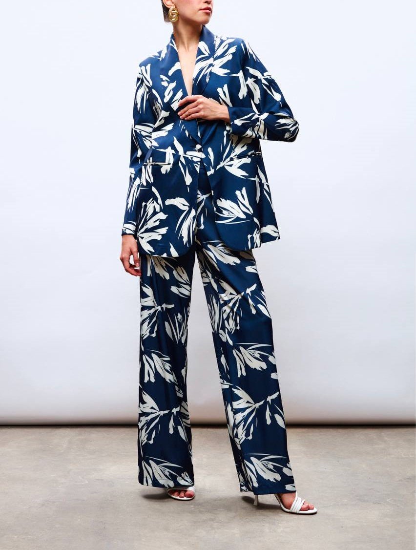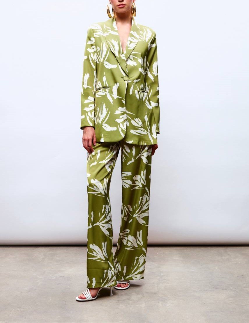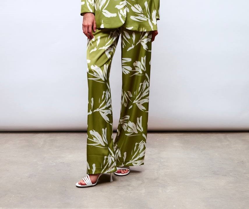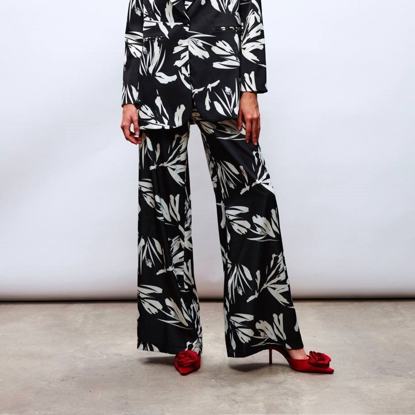 LEAF PATTERNED SILKY FLARED PANTS