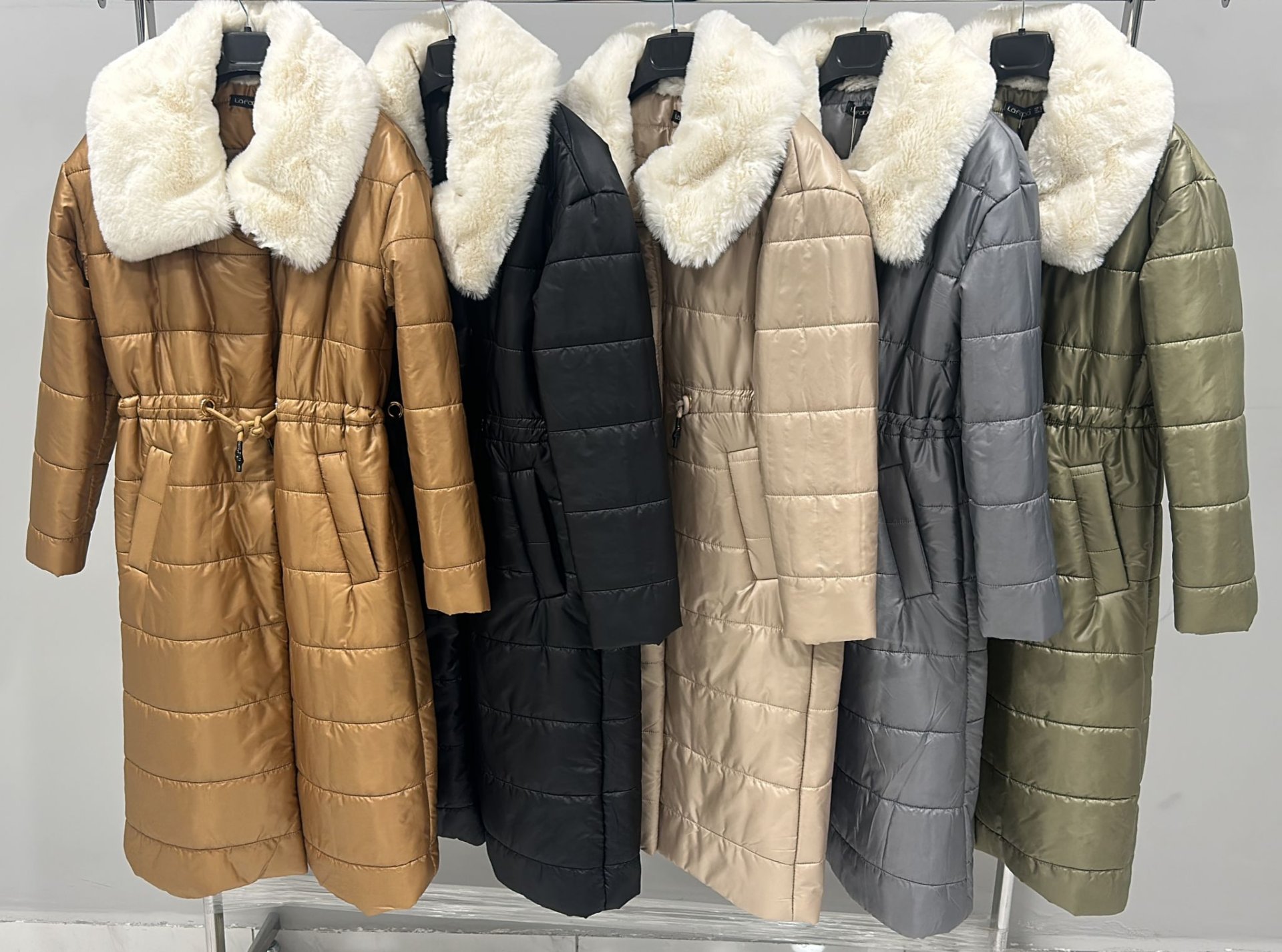 METALLIC PUFFER STYLE COAT WITH FAUX FUR COLLAR