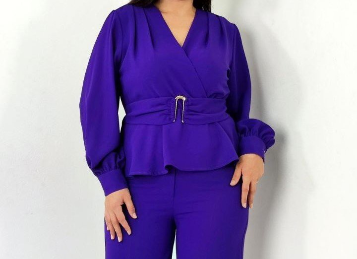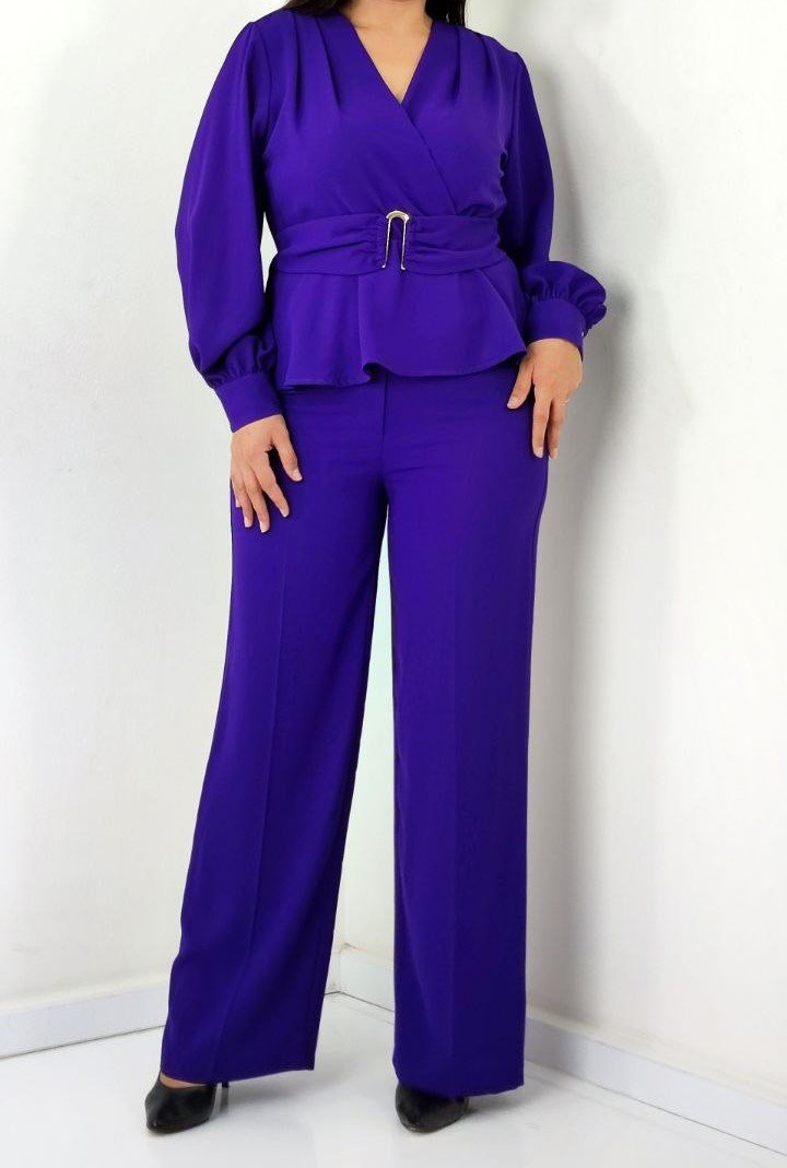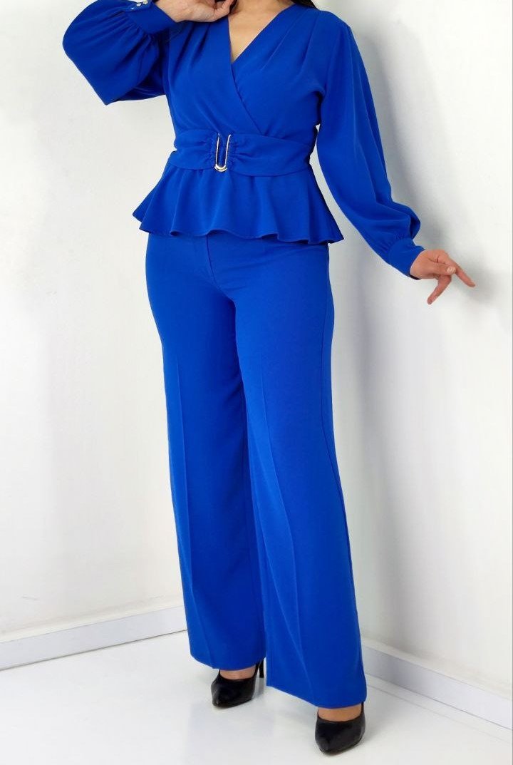 PEPLUM BELTED TOP AND MATCHING FLARED PANTS