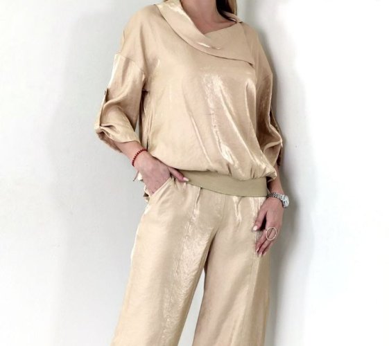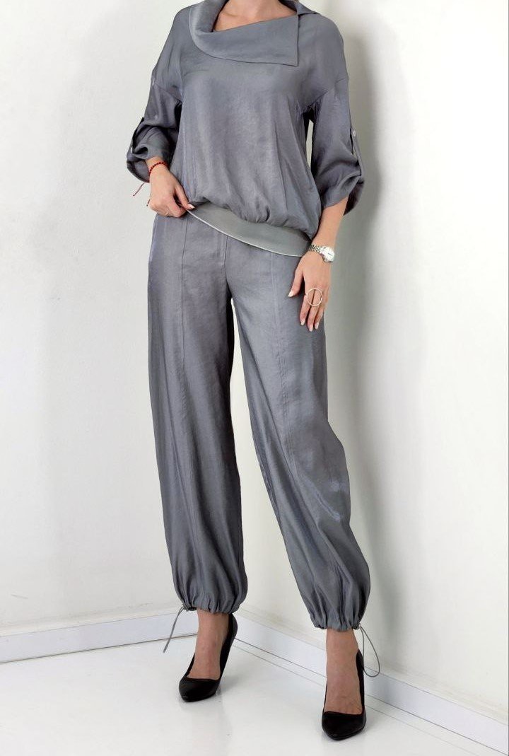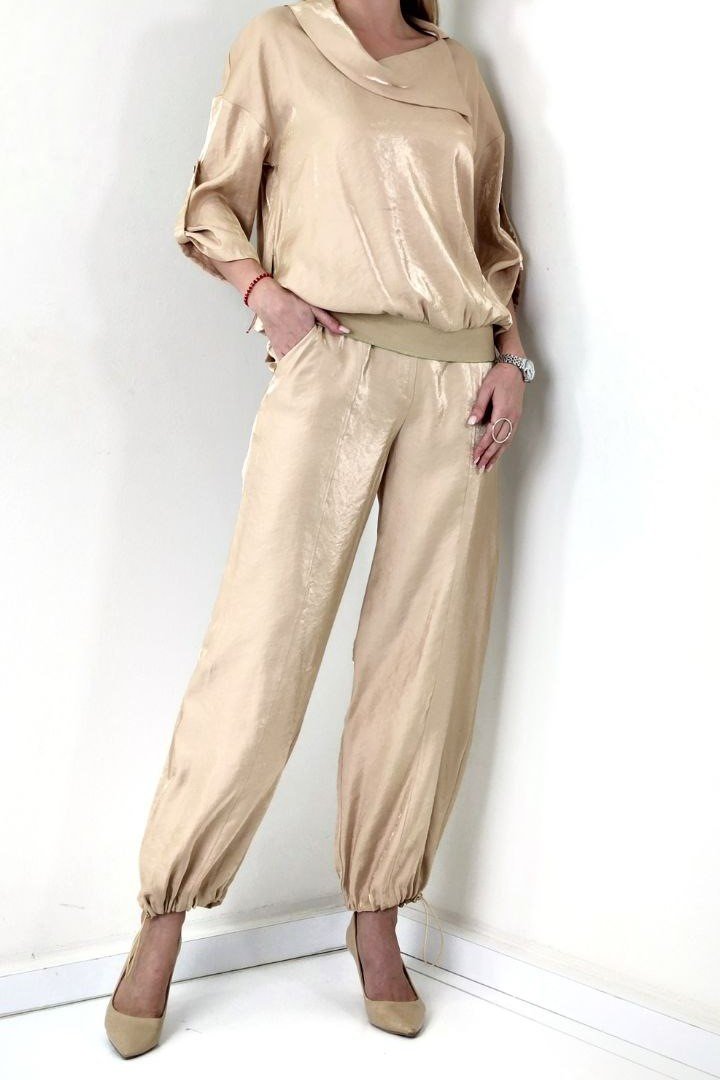 SATINY ANGLE NECKLINE TOP AND PARACHUTE PANTS