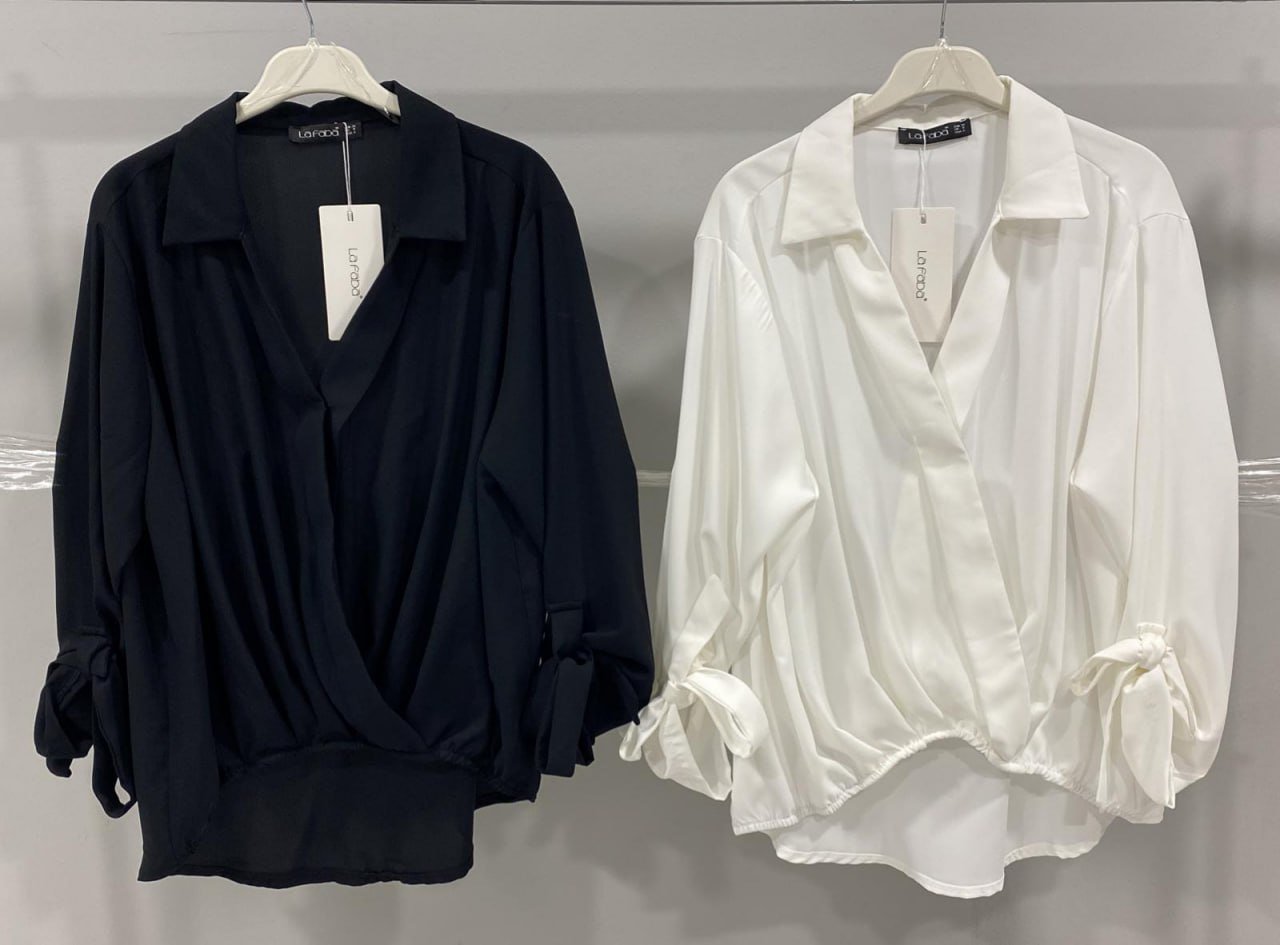 WRAP STYLE V NECK BLOUSE WITH TIE CUFFS
