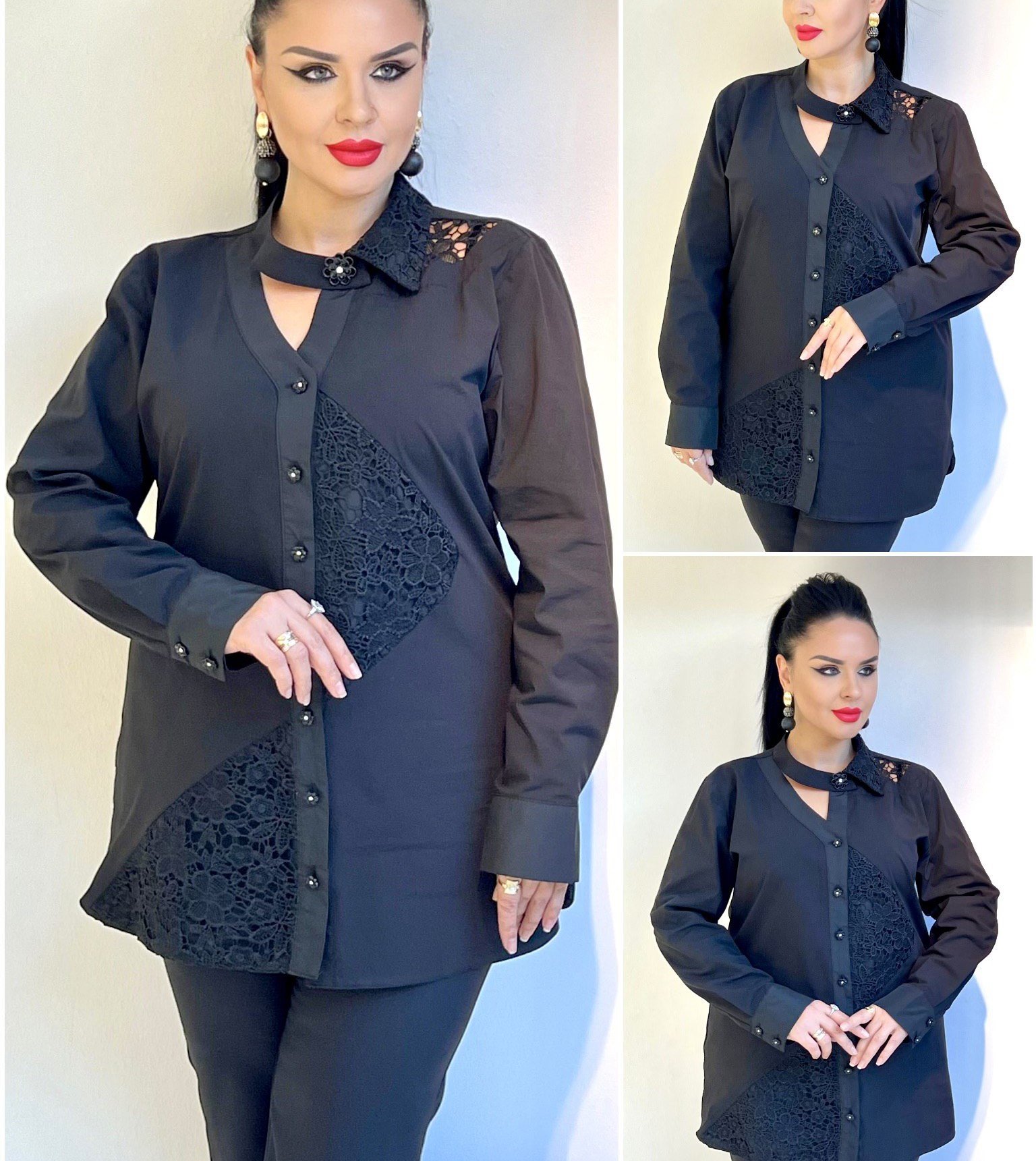 BUTTON BLOUSE WITH LACE INSERTS AND STRAP NECK DETAIL