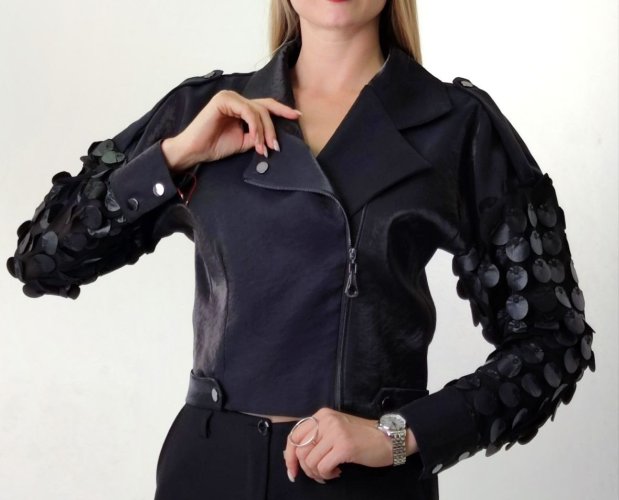 CROP JACKET WITH FAUX LEATHER DISC DETAIL AND ANGLE ZIPPER