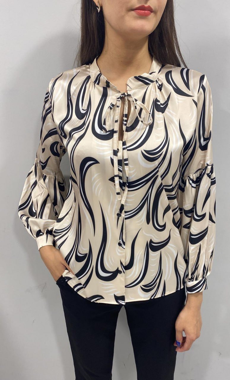 CURVED SILKY BLOUSE WITH TIE NECKLINE