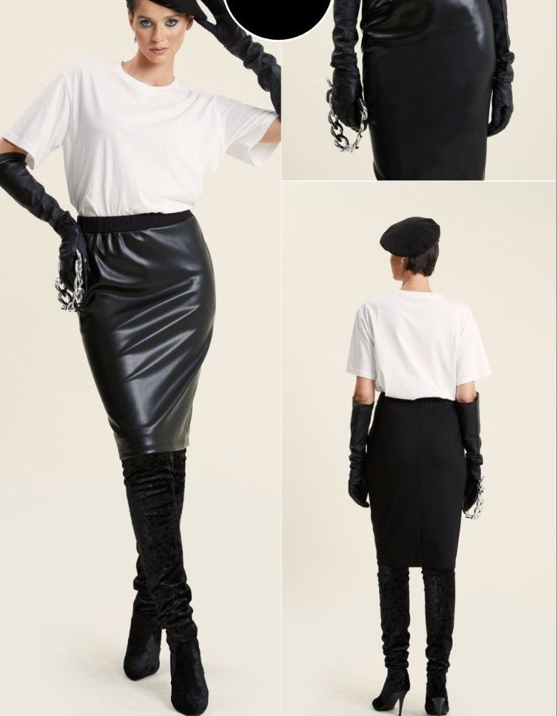 FABIC AND FAUX LEATHER FITTED SKIRT
