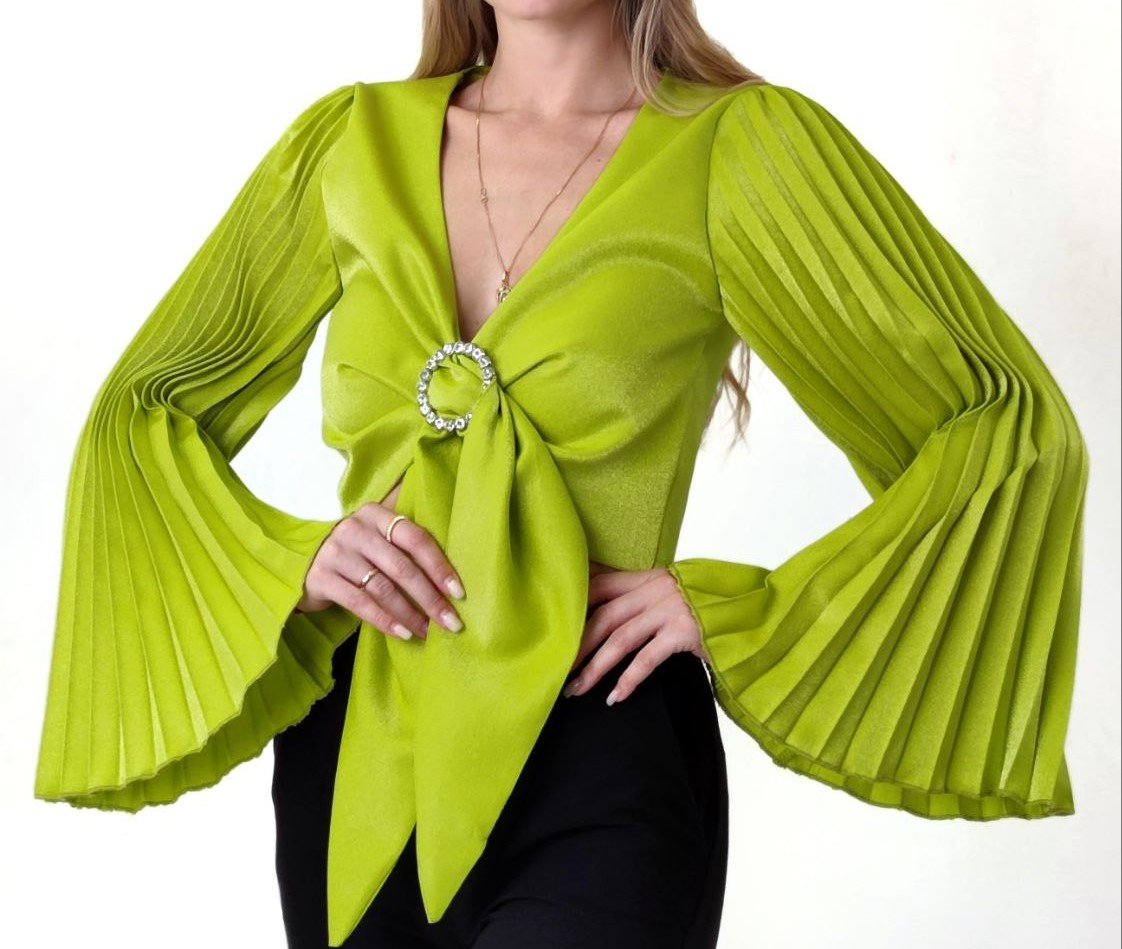 PLEATED WIDE SLEEVE WRAP BLOUSE