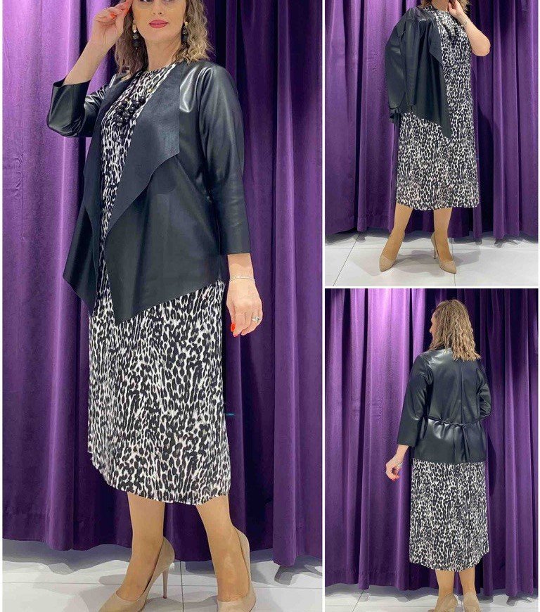 PRINTED DRESS WITH ASYMMETRICAL FAUX LEATHER JACKET