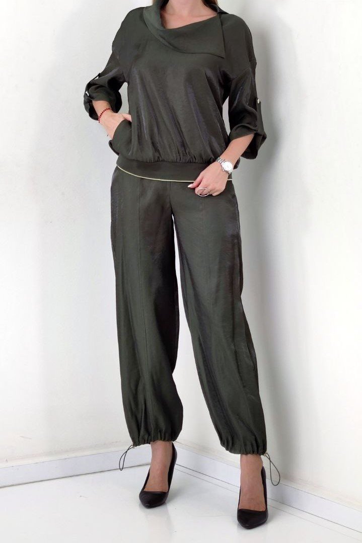 SATINY ANGLE NECKLINE TOP AND PARACHUTE PANTS